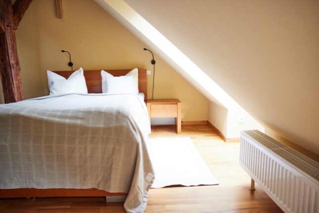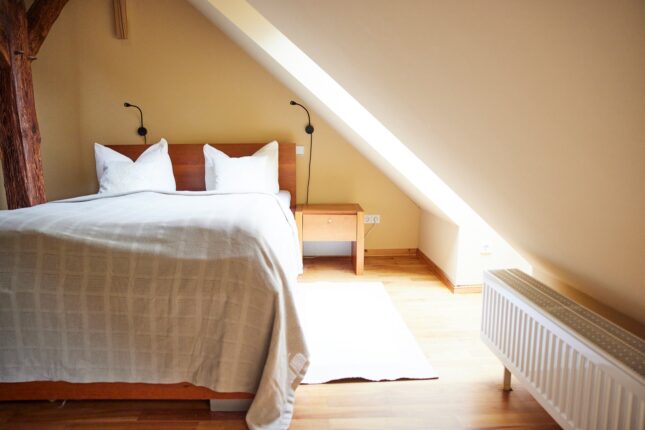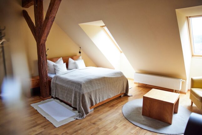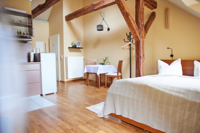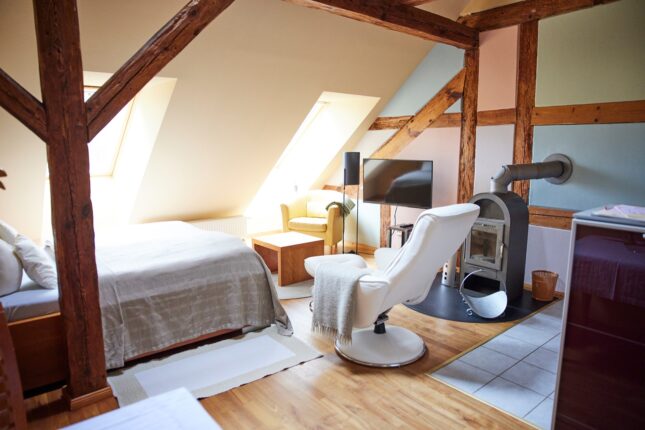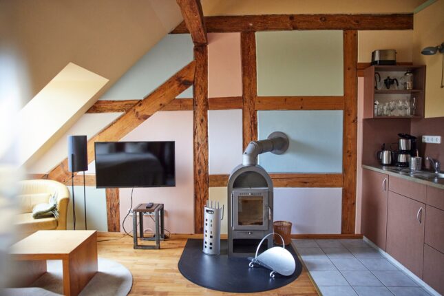 Das gemütliche Studio im Dachgeschoss überzeugt mit seiner offenen Gestaltung bis zur Spitze und drei großen Dachfenstern, die viel Licht hereinlassen. Die Fenster sind mit Sonnenschutz ausgestattet. Edles Kirschholzparkett und hochwertige Kirschholzmöbel verleihen dem Raum eine schlichte Eleganz. Ein Kaminofen sorgt in der Übergangszeit für wohlige Wärme.