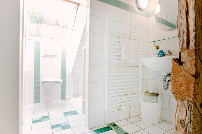 Ein modernes Kingsize Holzbett mit zwei Einzelmatratzen direkt unterm Dach ergibt eine kuschlige Schlafstätte. Kleiderschrank,Tisch und Stuhl und das bodentiefe Fenster runden das Bild ab.