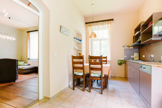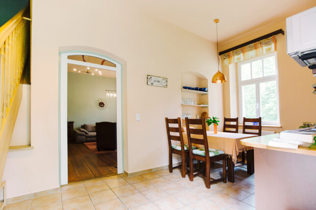 Die Küche ist mit einem 4er-Ceranfeld, Spülmaschine, Mikrowelle mit Heißluft und Grill, Toaster, Wasserkocher, Kaffeemaschine und vielem mehr ausgestattet. Salz, Pfeffer, Zucker, Gewürze, Essig, Öl und etwas Mehl sind vorhanden und ermöglichen ein erstes Kochen, das sogar für ein Wochenende ausreicht. Der große Esstisch lädt zu gemütlichen Mahlzeiten ein - von der Küche aus kommt man direkt zur Terrasse.